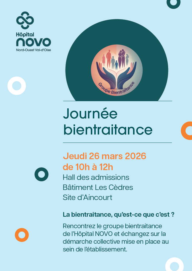 À l'occasion de la journée de la bientraitance, le groupe bientraitance de l'Hôpital NOVO sera présent sur les sites de Pontoise, Beaumont et Aincourt pour rencontrer les professionnels, patients et usagers.