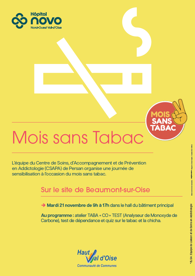 L’équipe ELSA* et le service de pneumologie du site de Pontoise, le SMR de pneumologie du site d’Aincourt tiendront un stand d’information avec un atelier « Tire ta clope », un TABA « CO » TEST (Analyseur de Monoxyde de Carbone) et des formations interactives en ligne « TABAGORA ».