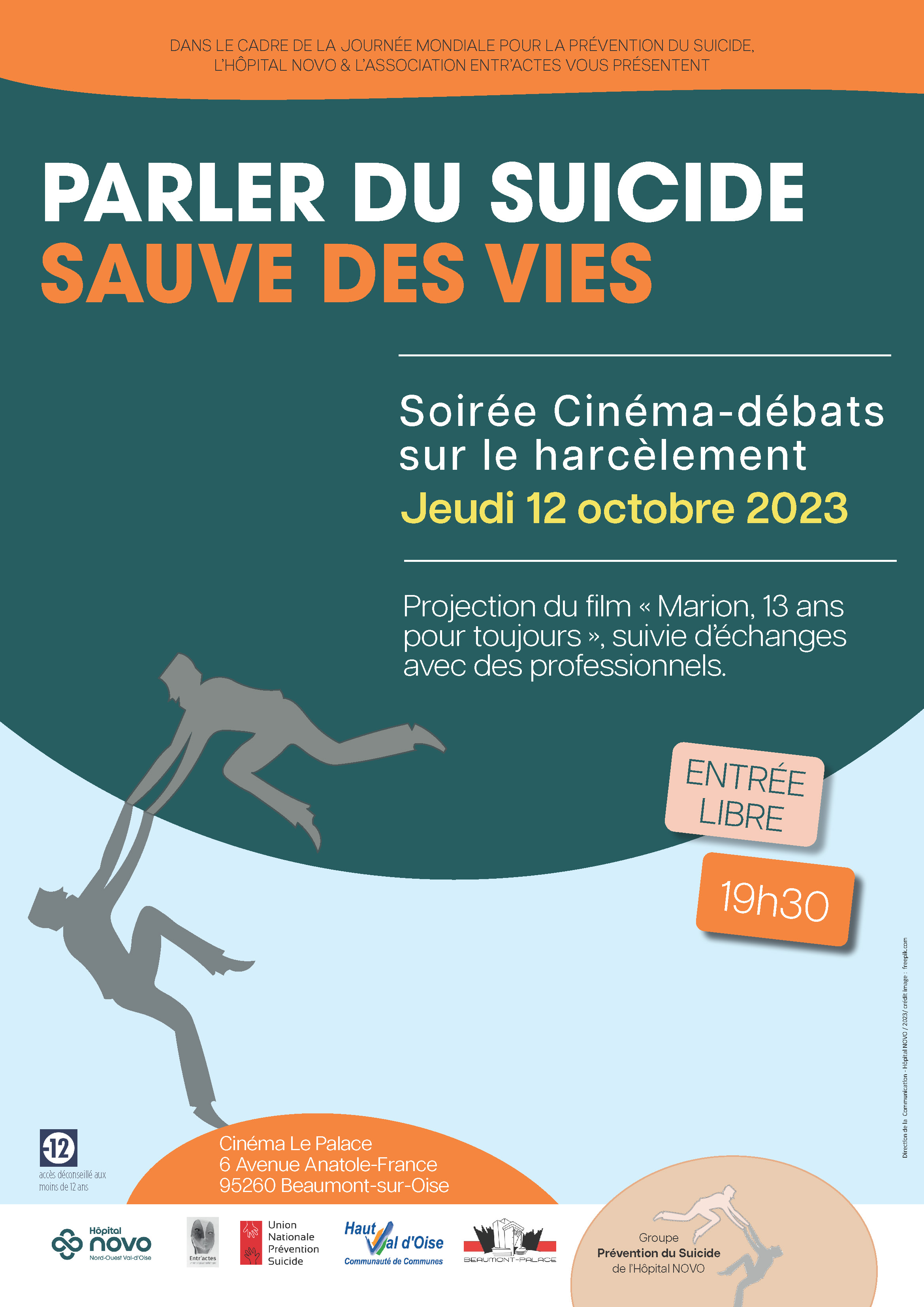 Le site de Beaumont-sur-Oise de l'Hôpital NOVO et l'association Entr'actes organisent une nouvelle soirée cinéma-débats sur la prévention du suicide le jeudi 12 octobre 2023 à 19h30 au Cinéma Le Palace (6 avenue Anatole-France 95260 Beaumont-sur-Oise).