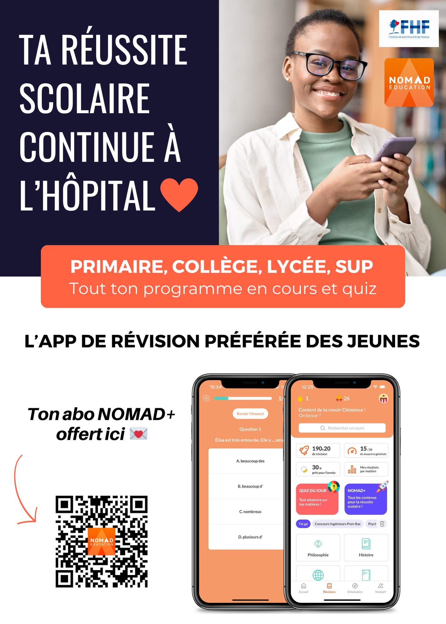 L'hospitalisation peut être une période difficile pour les enfants, tant sur le plan physique qu'émotionnel. Elle peut perturber leur scolarité. C'est pourquoi la FHF et Nomad Education unissent leurs forces pour offrir à tous les enfants hospitalisés un accès à un soutien scolaire de qualité, quel que soit leur état de santé ou leur lieu d'hospitalisation.